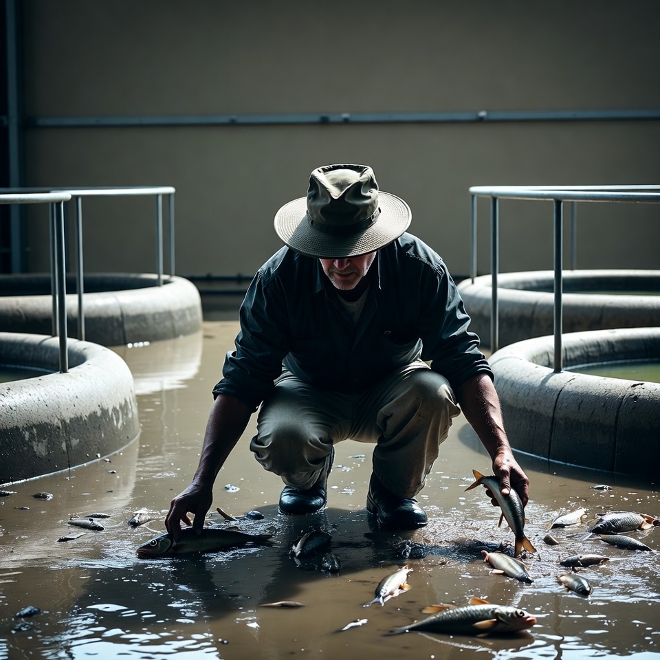 A man wearing a green hat and dark shirt squats in shallow water amid circular concrete fish tanks. He holds a small orange fish in his hand while several other fish lie scattered around his boots in the muddy water. Metal railings surround the industrial aquaculture facility.