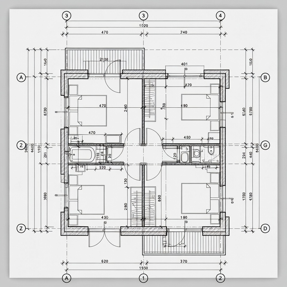 architecture, bathrooms, bedrooms, building plan, cad drawing, dimensions, home layout, house blueprint, labeled sections, measurements, residential design, rooms, stairs, technical drawing, two-story house, floor plan