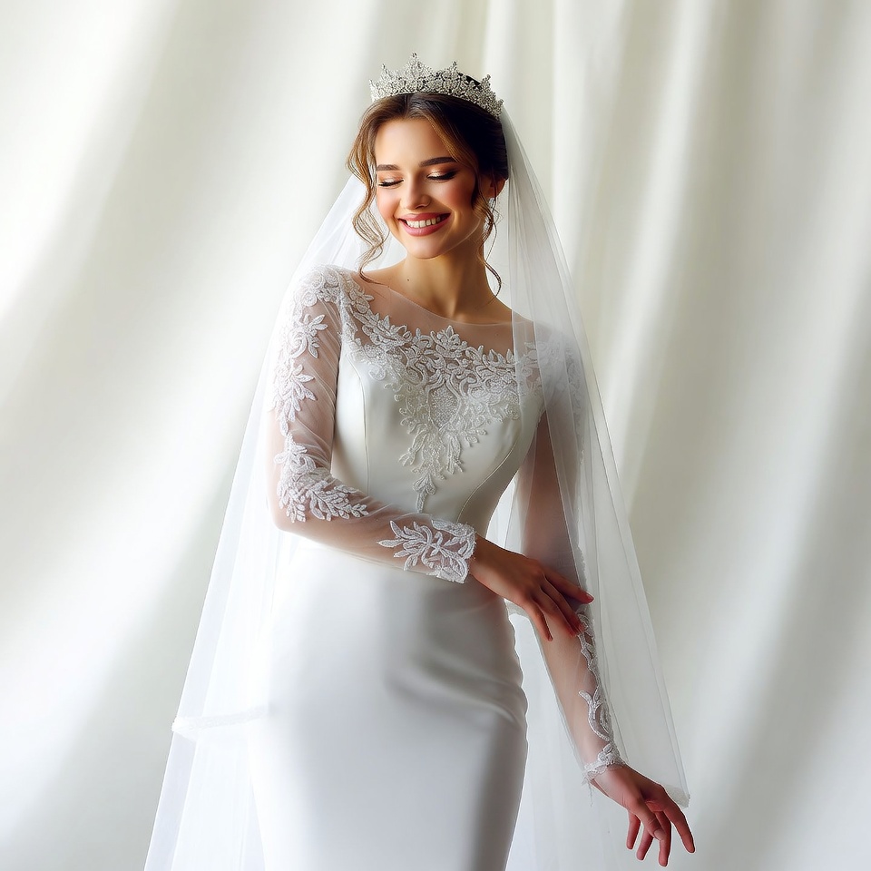 White, bridal fashion, bridal veil, elegant dress, female, happy bride, lace sleeves, long hair, long sleeves, portrait, sheer fabric, smiling woman, studio background, tiara, veil, wavy hair, wedding attire, wedding dress, white curtains, white gown, bride