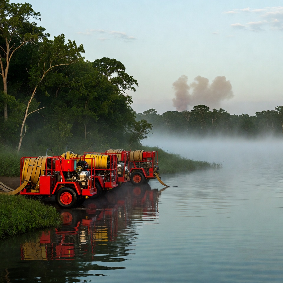Two red fire trucks with yellow hoses are parked along the edge of a calm lake surrounded by dense green trees. A plume of smoke rises in the distant sky amid a foggy mist. Their reflections are visible in the still water.