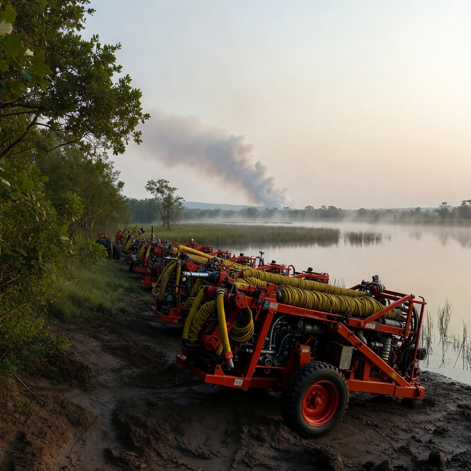 A row of red fire trucks with yellow hoses is parked on muddy ground near a calm lake surrounded by green trees. Thick smoke rises in the distant background under a twilight sky. Morning mist hovers over the water and reeds.