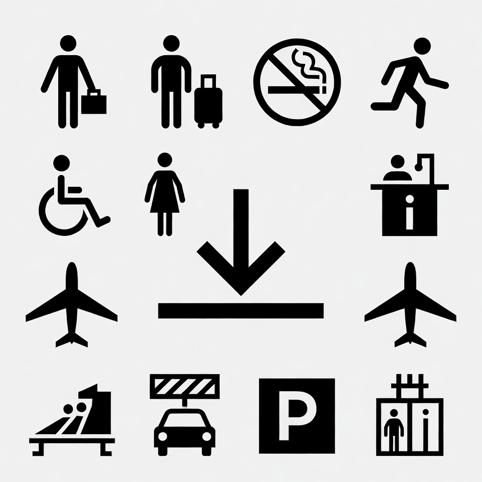 airplane, airport symbols, black icons, briefcase, car, down arrow, elevator, facility signs, girl, gray background, man, navigation signs, no smoking, parking, people icons, pictograms, running man, silhouettes, stick figures, suitcase, symbols, wheelchair, woman, airport icons