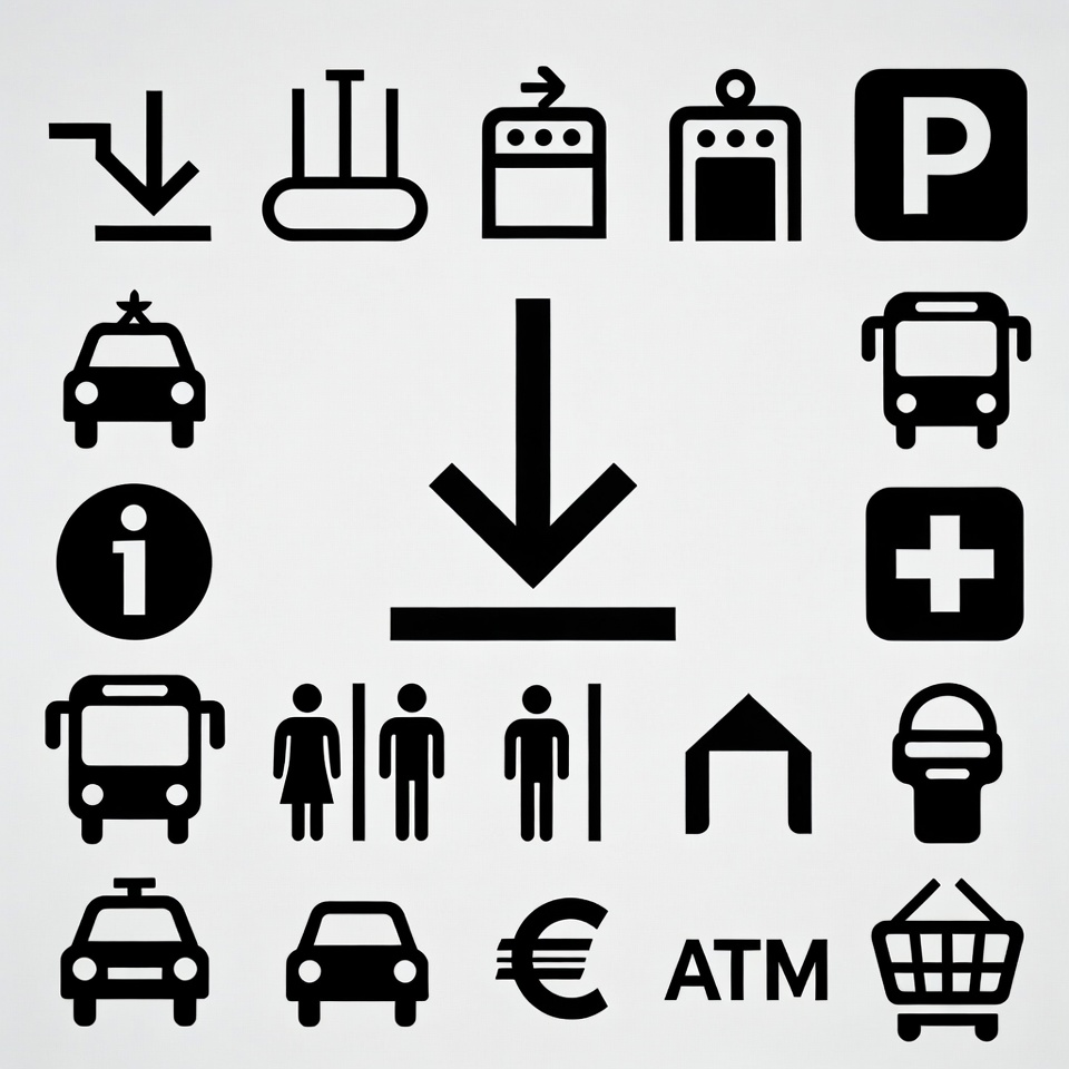 ATM, arrow, black white, bucket, bus, car, clipart, elevator, escalator, euro, female, hospital, house, illustration, information, isolated background, line art, male, navigation, parking, restrooms, shopping basket, signs, symbols, taxi, transportation, icons