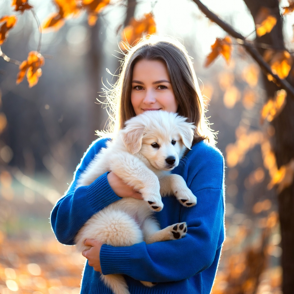 A young woman with long brown hair smiles while holding a fluffy white puppy in her arms. She wears a blue sweater and stands among trees with orange and yellow autumn leaves. Sunlight filters through the colorful foliage in the background.