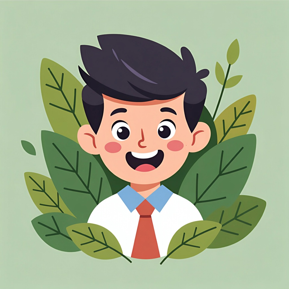 A cartoon boy with short black hair smiles happily, surrounded by large green leaves on a light green background. He wears a white collared shirt and red tie. His large expressive eyes and rosy cheeks add to the cheerful illustration.