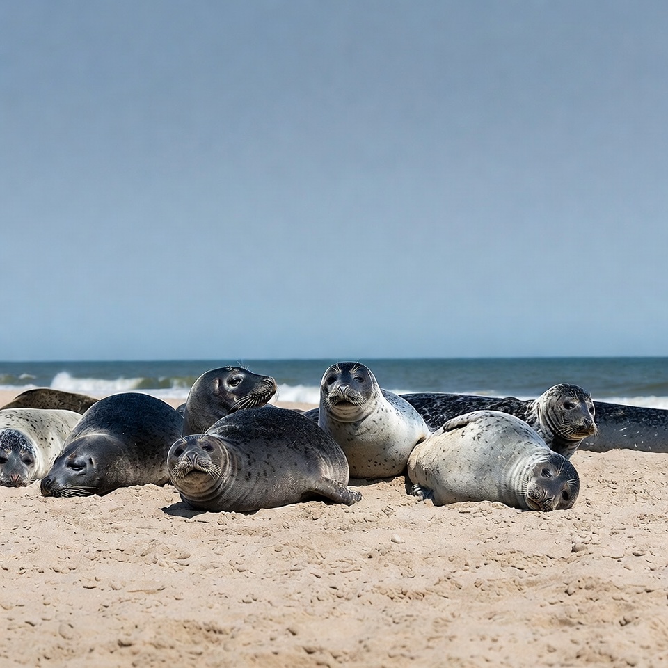 baby seals, beach, blue sky, gray seals, group seals, harbor seals, marine mammals, nature, ocean, outdoors, resting seals, sandy shore, sea animals, spotted fur, waves, wildlife, seals