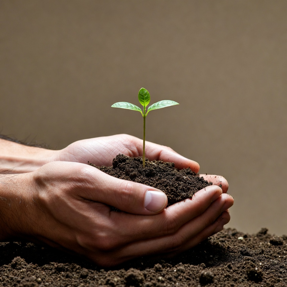A pair of male hands cups a small green sprout emerging from moist soil. The seedling has tender leaves and is held gently over a neutral background. The soil is dark and clumped around the plant's base.