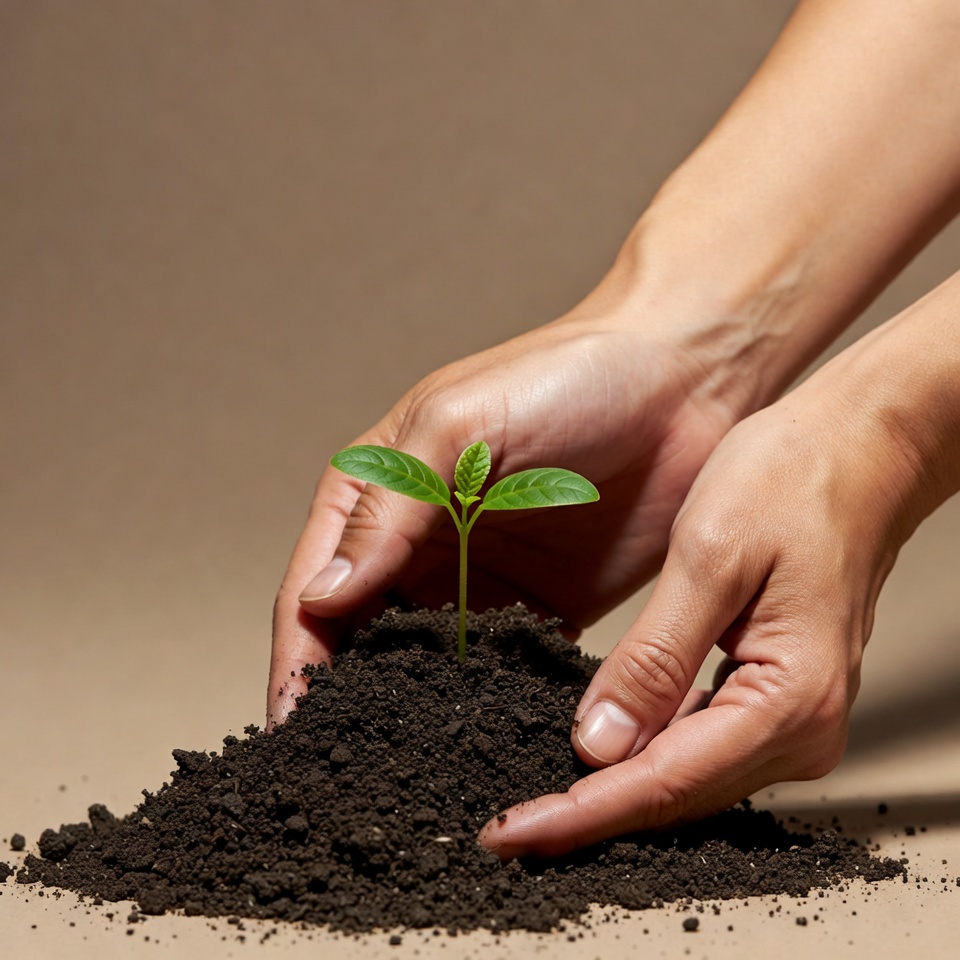 Two hands gently cup a small green sprout emerging from a pile of dark soil. The sprout has tender leaves and is positioned on a neutral brown background. The hands are positioned protectively around the plant base.