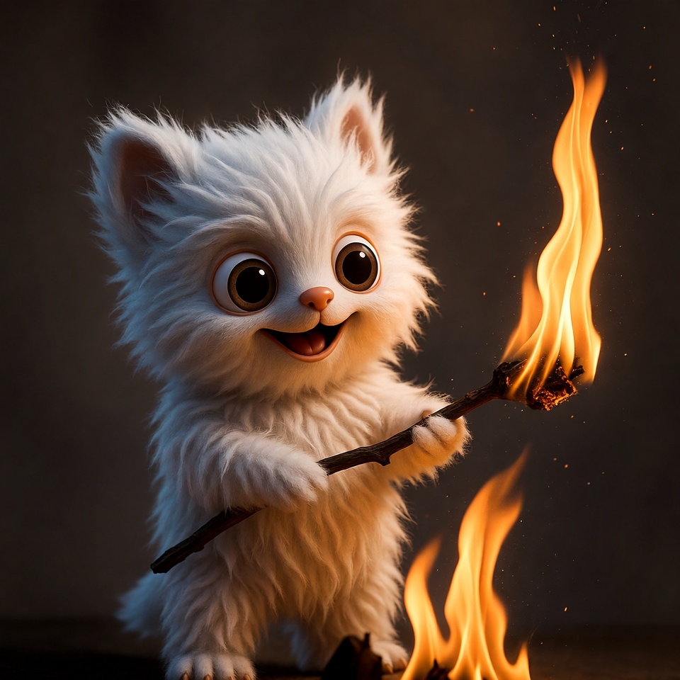 A fluffy white kitten with big expressive eyes happily holds a wooden stick with bright orange flames at the tip. It stands on a dark surface with a subtle gradient background, showcasing its soft fur and playful expression. The illustration style emphasizes the fire's glow and the kitten's adorable features.