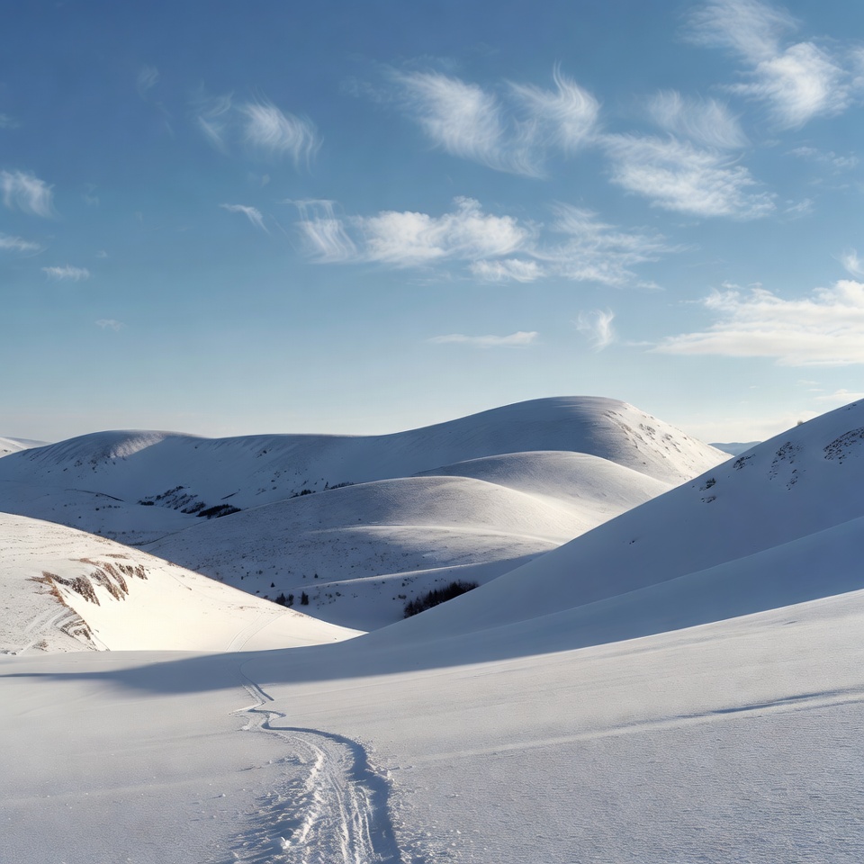 Snow-covered rolling hills stretch under a clear blue sky with scattered white clouds. A single snow trail winds through the foreground valley amid the white landscape. Rocky outcrops are visible on some hillsides.
