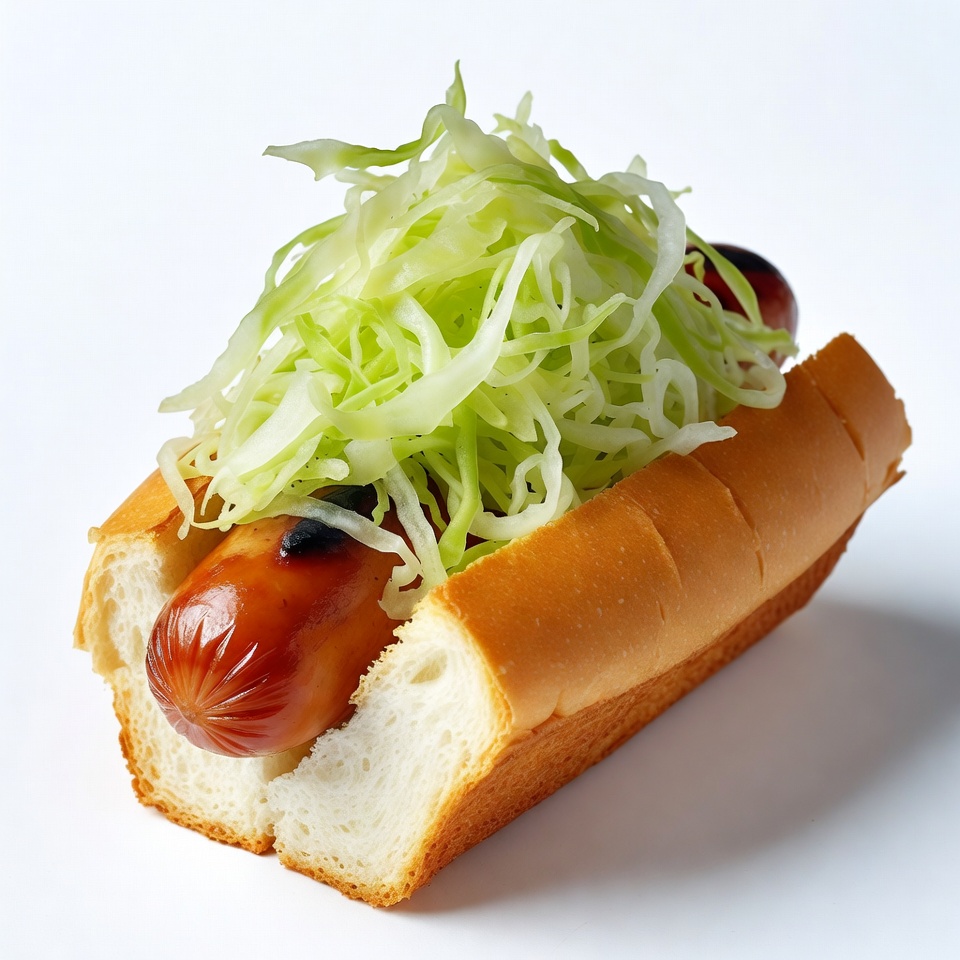 A hot dog in a white bun is topped with a generous pile of shredded green cabbage slaw. The sausage is grilled with visible char marks and sits snugly between the soft bread halves. The entire image is isolated on a plain white background.