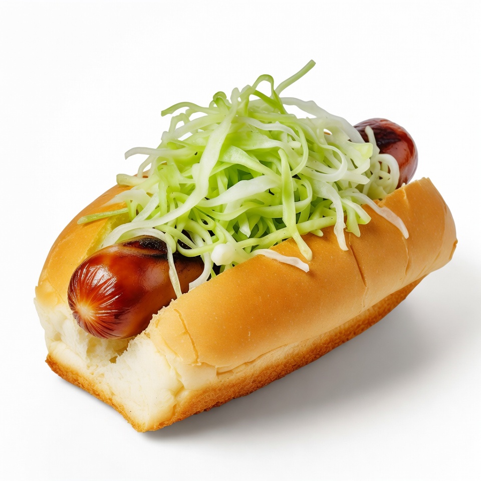 bun, cabbage slaw, delicious, fast food, food, fresh cabbage, grill marks, grilled sausage, hotdog, isolated, meal, sauce, sausage, shredded cabbage, snack, street food, topping, white background, hot dog