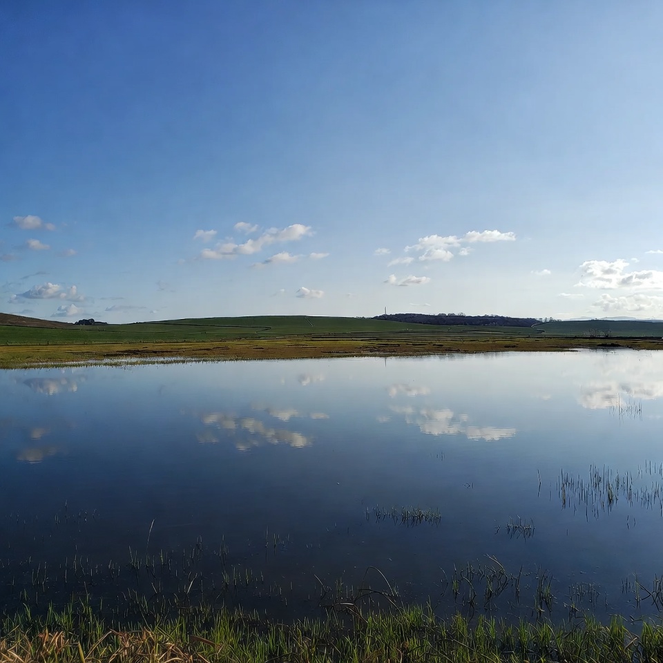 autumn grass, blue sky, calm water, clouds, daylight, fields, grass, green fields, hills, horizon, lake, landscape, marsh, mirrored sky, nature, outdoors, reflection, rural, scenery, sky, water, wetlands, pond