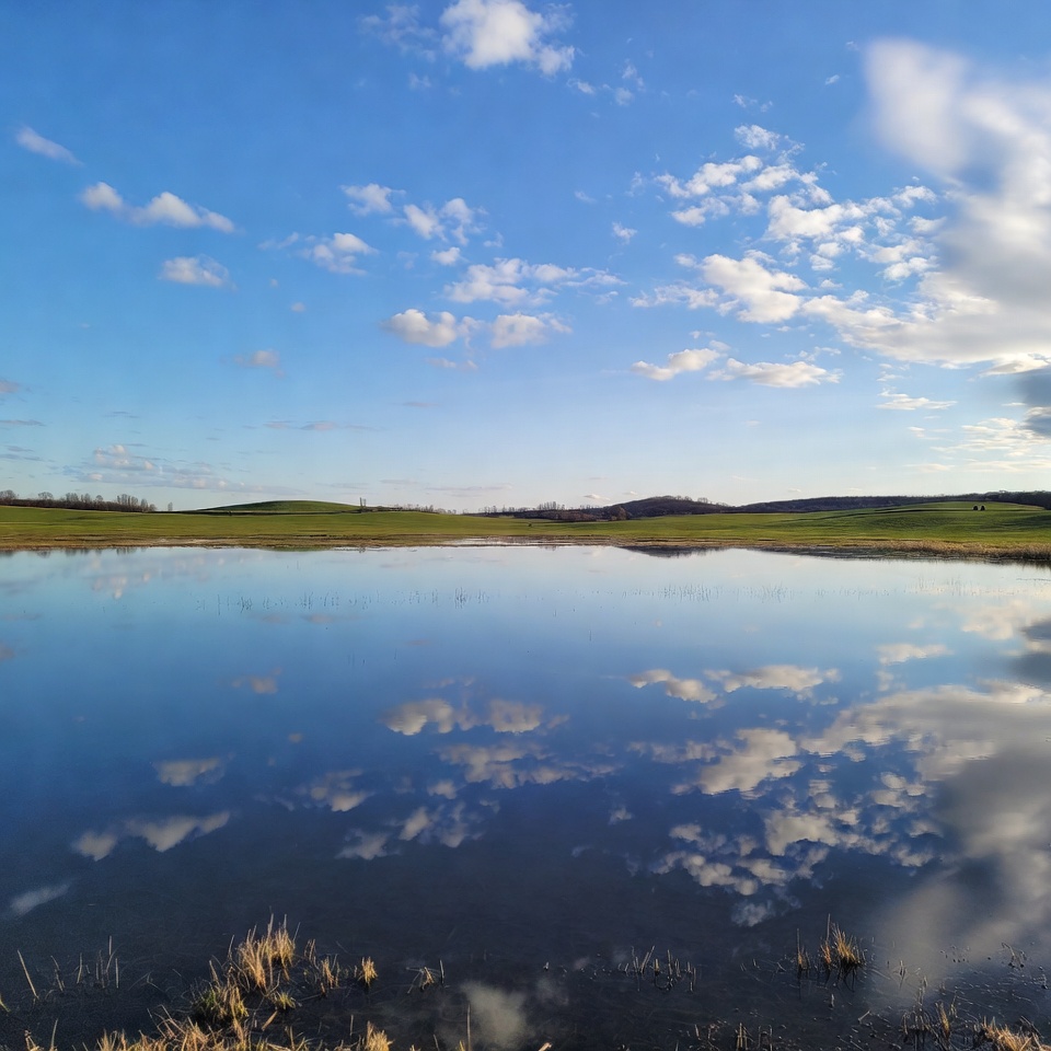 blue sky, clear water, clouds reflection, fields, fluffy clouds, grass, grassy fields, green hills, landscape, mirror image, nature, reeds, reflection, rural landscape, scenery, serene pond, sky reflection, water, white clouds, pond