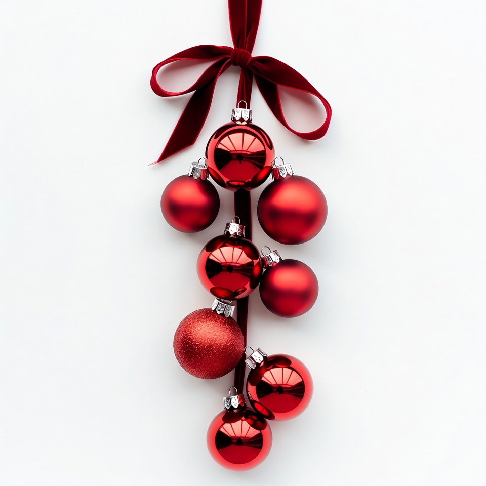 Christmas balls, Christmas decor, baubles cluster, cascading ornaments, festive decor, glitter bauble, glossy ornaments, hanging ornaments, holiday balls, holiday decorations, ornament cluster, red baubles, red ribbon, red spheres, shiny balls, silver hooks, velvet ribbon, white background, winter holidays, Christmas ornaments