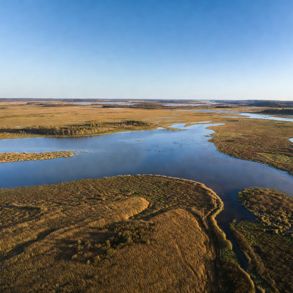 aerial view, autumn landscape, blue water, bog, clear sky, drone photo, earthy tones, environmental, floodplain, golden grass, grassland, horizon, natural habitat, nature, outdoor scenery, reed beds, rivers, streams, swamp, topography, vast landscape, water channels, waterways, wetlands, wilderness, marshland