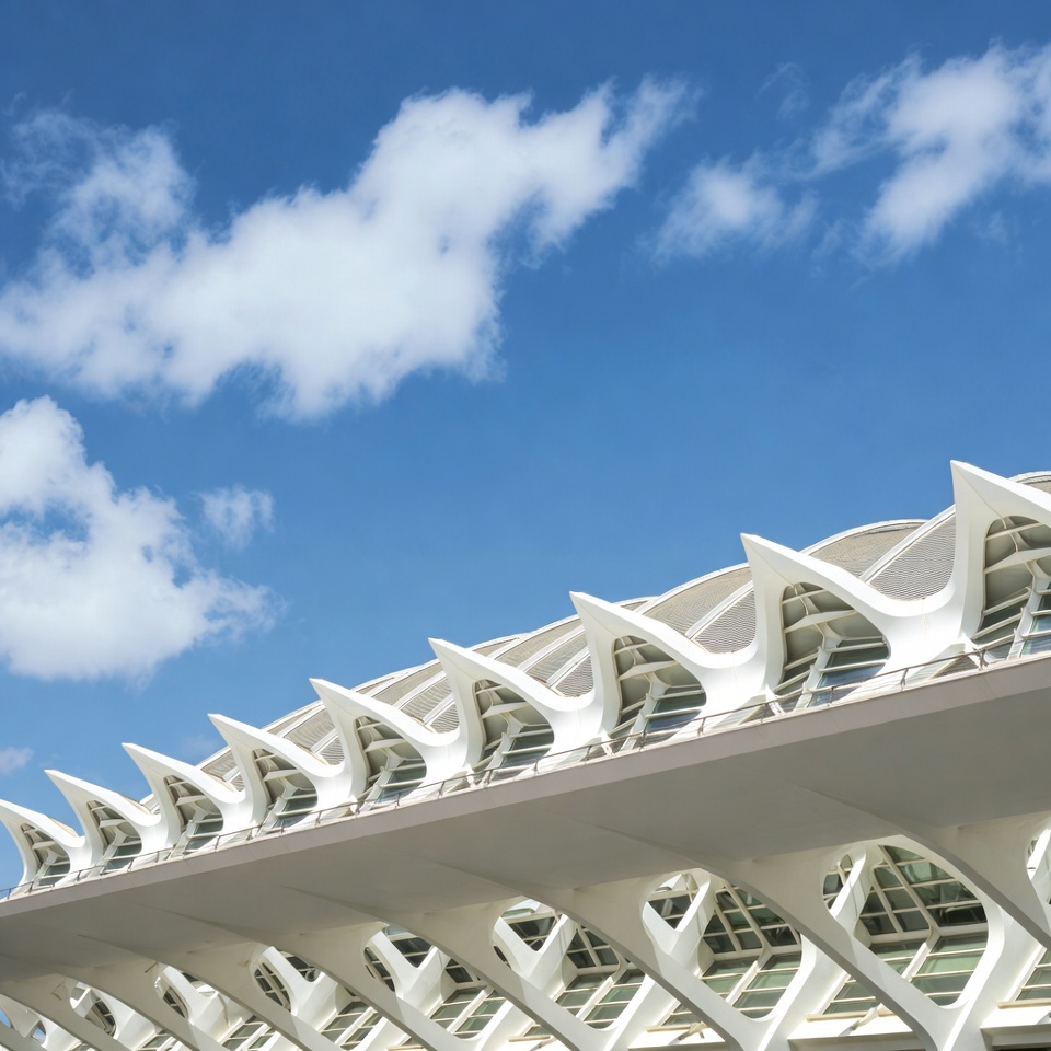 City of Arts, Valencia building, blue sky, curved panels, daylight, futuristic design, iconic landmark, modern building, outdoor, sail-shaped roof, sails architecture, structure, white clouds, white roof, architecture