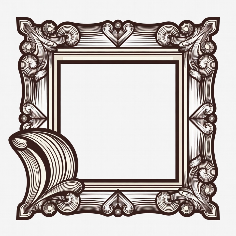 art frame, baroque style, blank frame, clipart, curved flourish, decorative frame, elegant frame, empty frame, floral pattern, graphic design, heart motifs, illustration, isolated, line art, ornate frame, swirling design, vector art, vintage frame, white background, picture frame