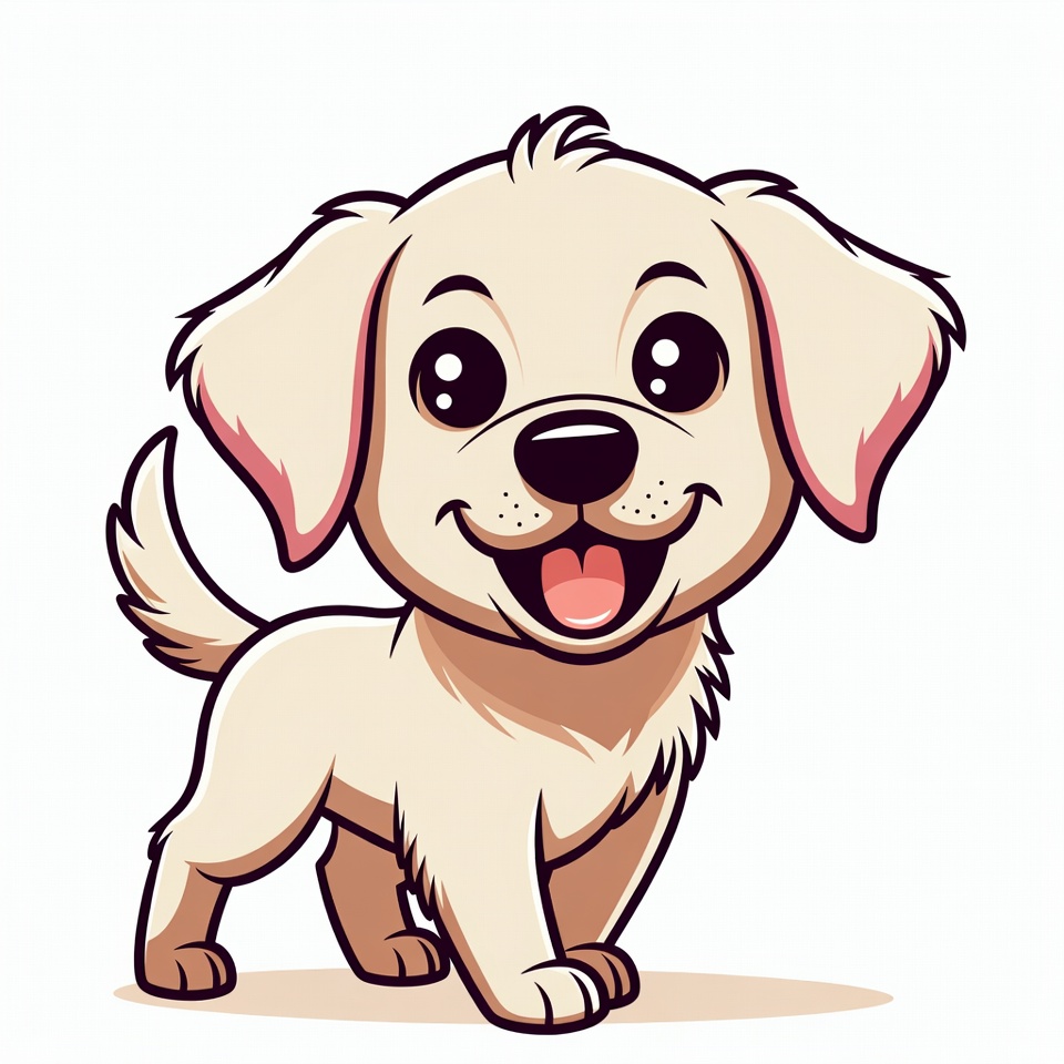 A cute cartoon illustration of a fluffy golden retriever puppy standing on a white background. The puppy has large expressive eyes, a smiling mouth with tongue out, and floppy ears. Its fur is depicted in soft beige tones with detailed shading.