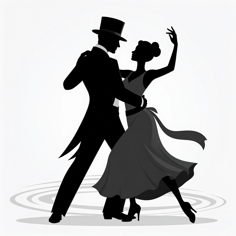 A black silhouette illustration depicts a man and woman dancing ballroom style on a white background. The man wears a tuxedo and top hat while holding the woman, who is dressed in a flowing gown with high heels and her hair in a bun. Subtle circular motion lines emphasize their elegant dance pose.