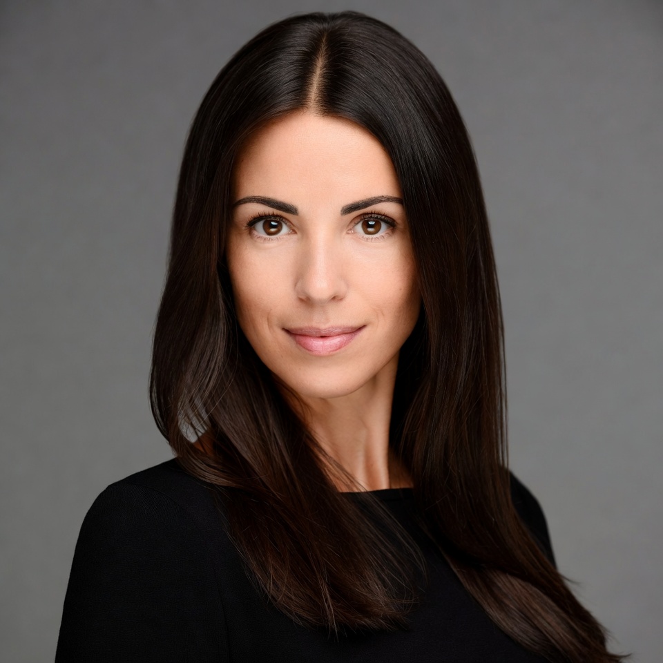 black top, brown eyes, dark hair, fair skin, female, gray background, headshot, long hair, middle part, portrait, professional headshot, smiling, straight hair, woman