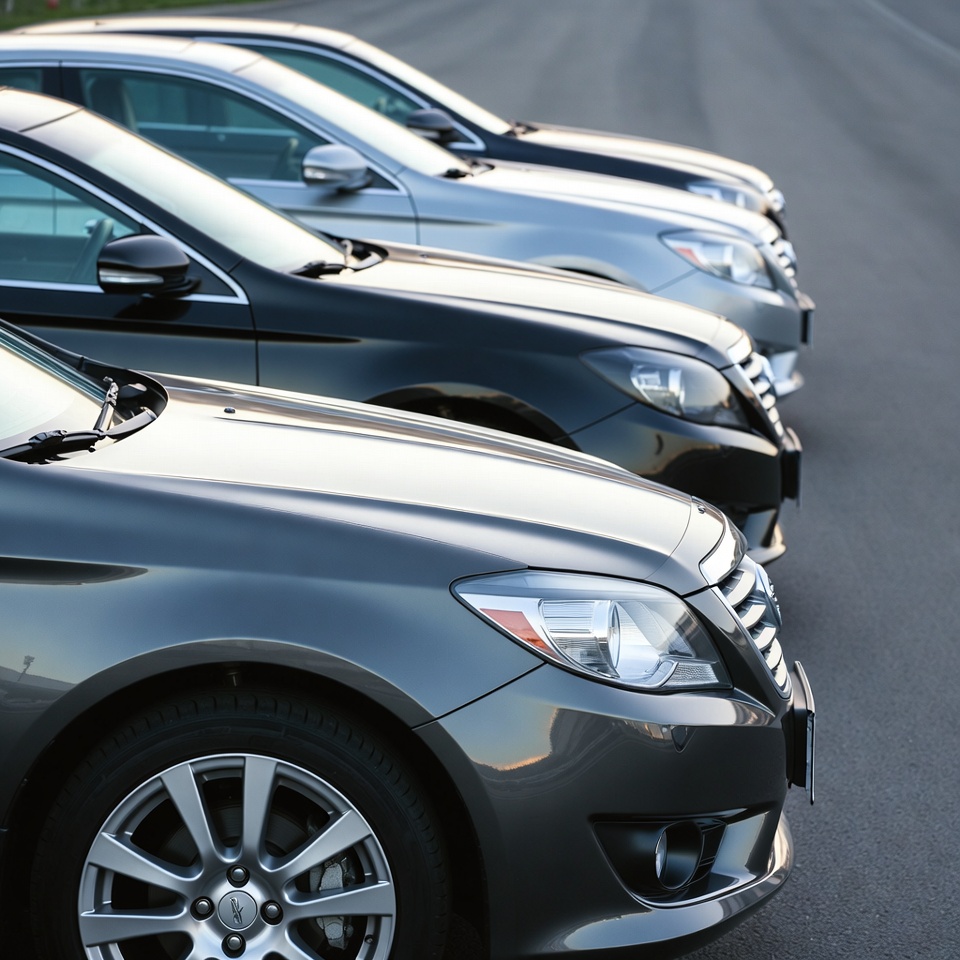 A row of several modern cars in different colors is parked along a paved road. The vehicles include silver, black, and gray sedans with shiny exteriors and alloy wheels. They are lined up parallel to the asphalt surface under natural light.