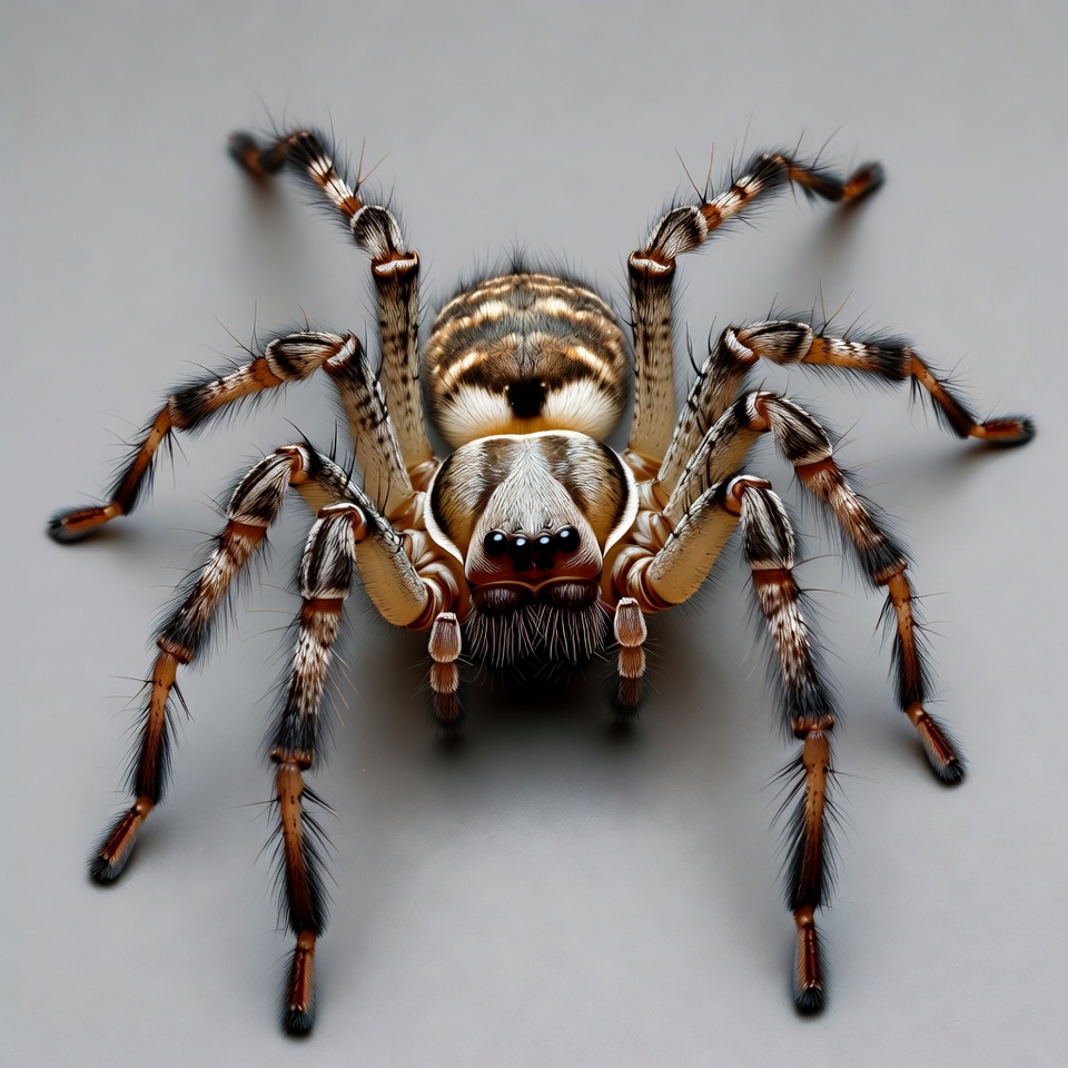 A detailed striped wolf spider with brown and white banded legs and body faces forward on a plain gray background. Its fangs and eyes are prominently visible, with fine hairs covering its exoskeleton. The spider is positioned in a close-up view, legs spread out.