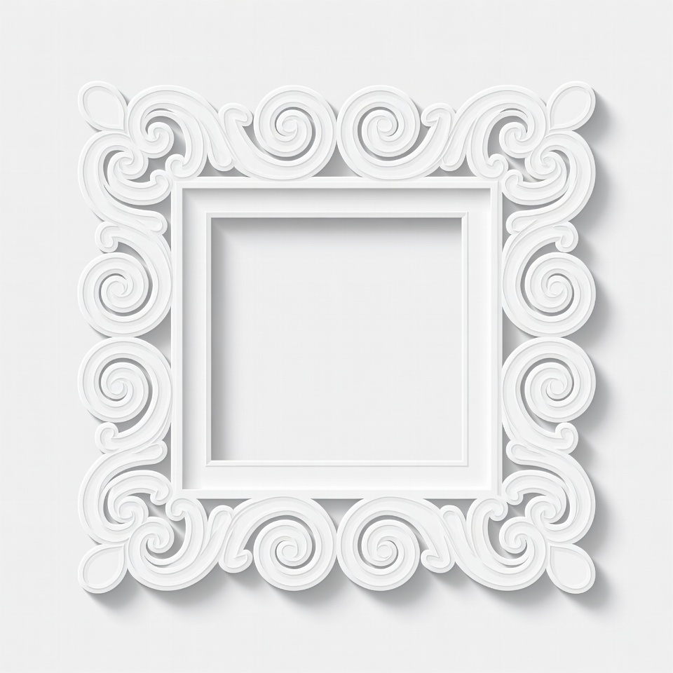 A white ornate picture frame with intricate swirling designs and floral motifs frames an empty square space. The frame features elaborate curls and decorative elements on all sides. It is rendered in a 3D paper cutout style on a white isolated background.