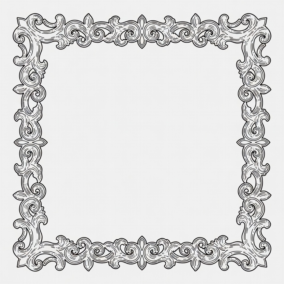 A detailed black and white line art frame features intricate floral and scrollwork designs. The elegant border surrounds an empty white space, perfect for overlays. It has a vintage baroque style with symmetrical corner flourishes.