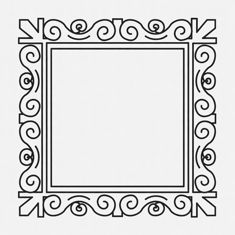 A detailed black line art frame features intricate swirling and curly decorative patterns around all four edges. The interior of the square frame is completely empty and white. The design has ornate corner flourishes and symmetrical motifs.