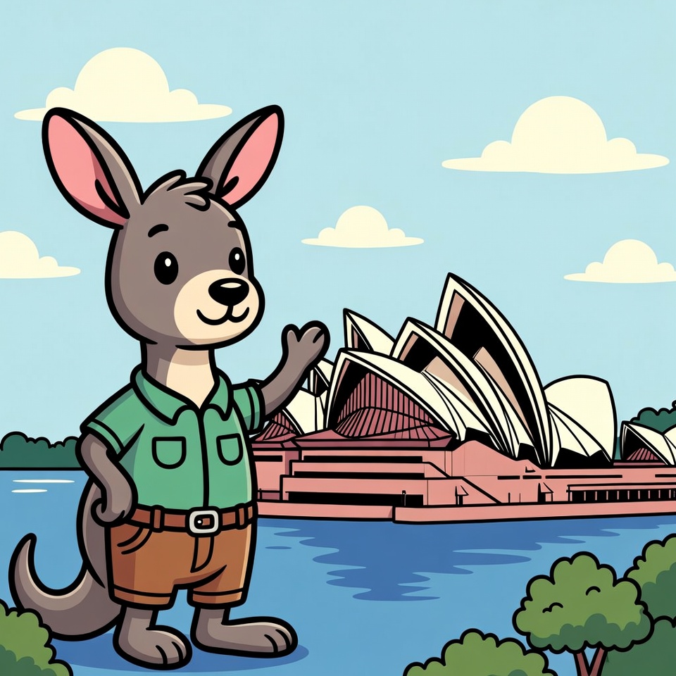 A cute cartoon kangaroo with large ears and a friendly smile waves while standing in front of the iconic Sydney Opera House. The kangaroo wears a green shirt, brown shorts, and a belt, set against a blue sky with clouds, green trees, and blue water. The scene features a vibrant, illustrated style on an isolated background.