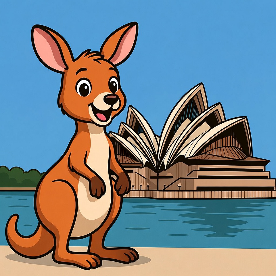Australia, Australian icon, Opera House, Sydney Opera House, big eyes, blue sky, cartoon kangaroo, clipart, cute animal, dock, illustration, isolated background, landmark, smiling kangaroo, vector art, water, kangaroo