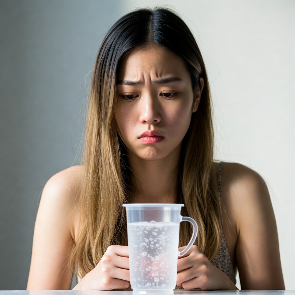 A young Asian woman with long dark hair streaked with blonde holds a clear plastic cup filled with sparkling water. She gazes downward with a concerned expression, her brows furrowed and lips pursed. She sits at a table against a plain light gray background.