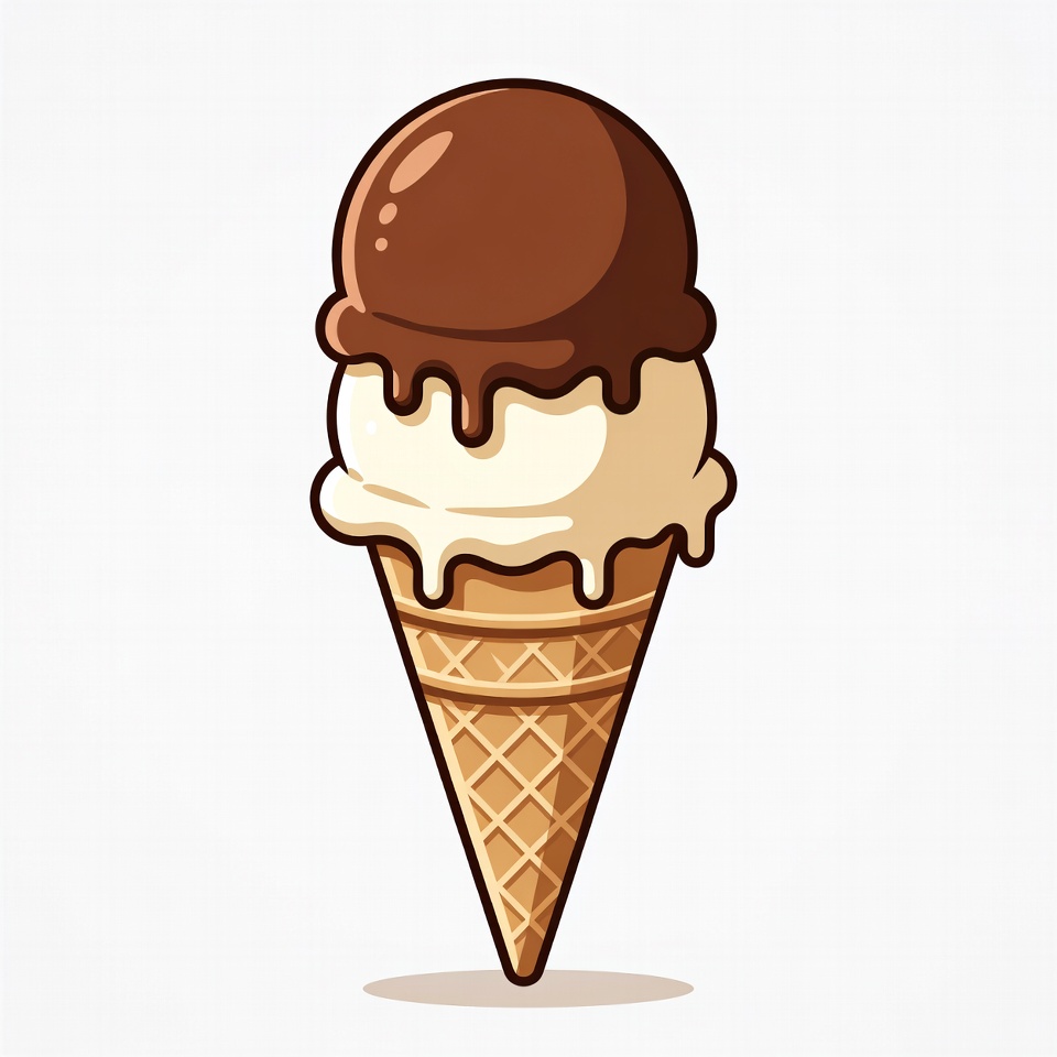 cartoon, chocolate, clipart, cone, dessert, double scoop, drip, food, illustration, isolated background, sweet, vanilla, vector, waffle cone, ice cream