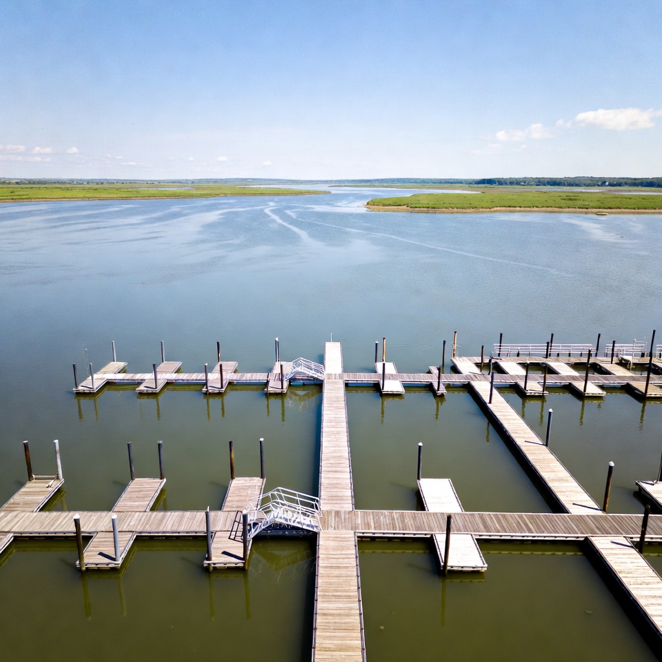 aerial view, blue sky, boats absent, calm water, dock pilings, docks, drone photo, empty marina, estuary, green marsh, green water, landscape, marshland, metal stairs, nature, outdoor, overhead view, pier, summer, water, waterfront, waterway, wooden docks, wooden pier, marina