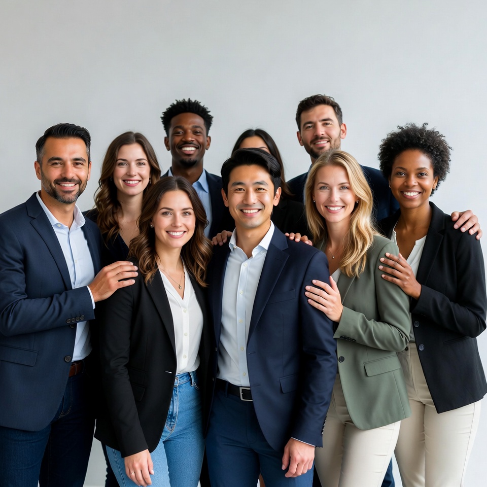 African-American, Asian, Latino, White, blazers, business people, colleagues, corporate group, diverse group, formal attire, group photo, happy faces, men, multiracial, office workers, professionals, smiling, suits, team standing, white background, women, business team
