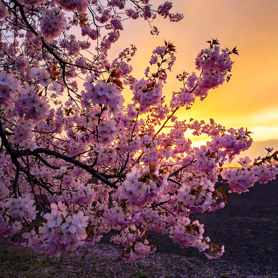 Japan, bloom, blossoms, branches, dusk, floral, flowering tree, golden hour, hanami, isolated background, landscape, nature, orange sky, outdoor, petals, pink flowers, sakura, scenery, spring, sunset, tree, twilight, vibrant, cherry blossom