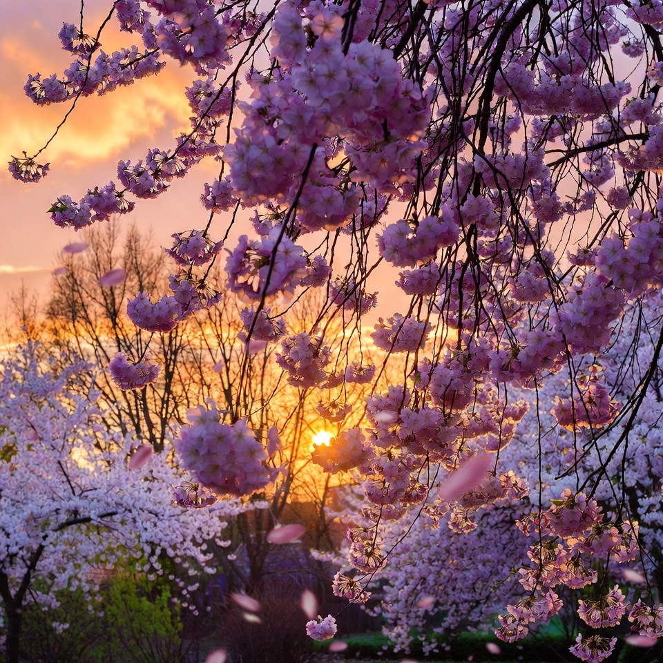 Japan, blooming trees, blossoms, branches, clouds, falling petals, hanami, landscape, nature, petals, pink flowers, sakura, scenery, spring, sun, sunset, tree branches, twilight, vibrant, warm light, cherry blossoms