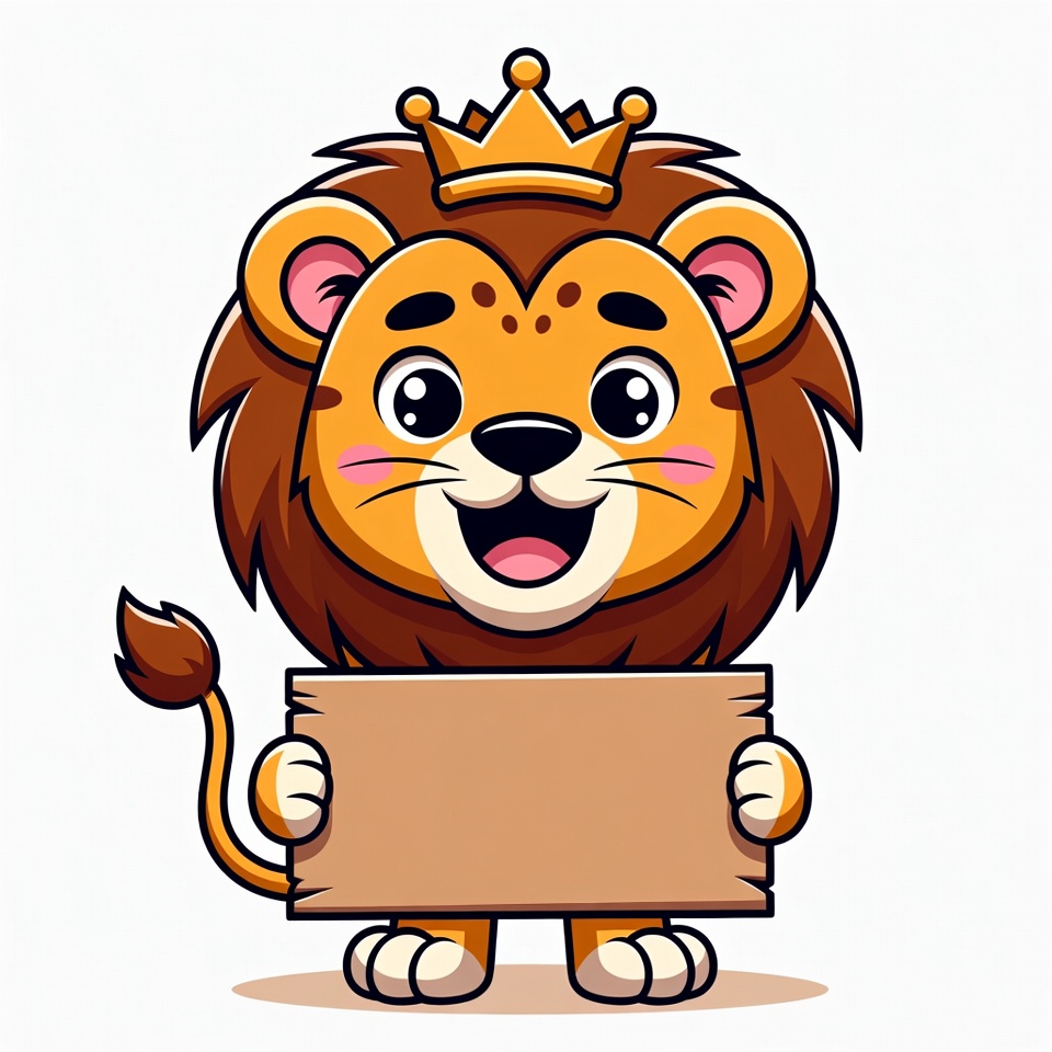 A cute cartoon lion with a golden crown stands on all fours holding a large blank wooden sign. The lion has big expressive eyes, a wide smiling mouth, and fluffy orange fur with a brown mane. It is illustrated in a vibrant, kawaii style on a white isolated background.