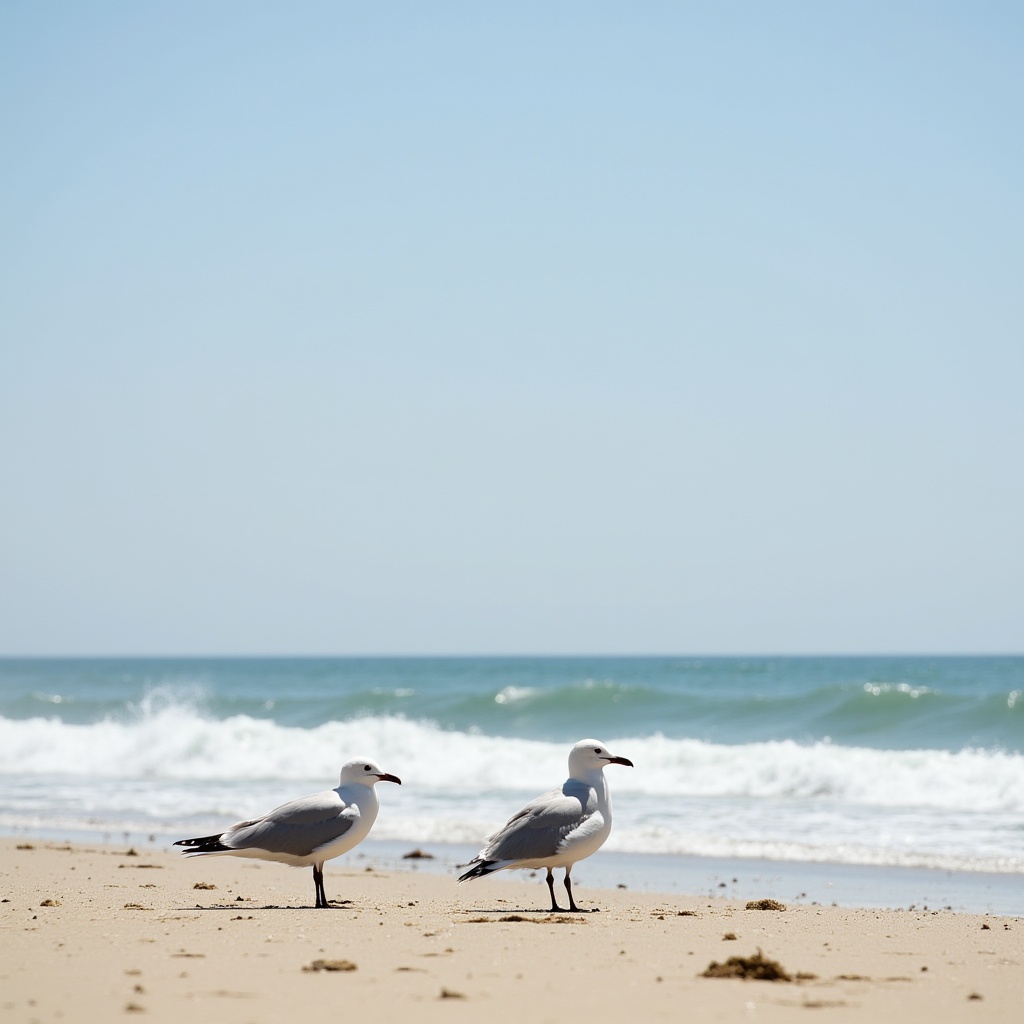 Two white seagulls stand on a sandy beach with gentle waves crashing nearby. The ocean water appears turquoise under a clear blue sky. The birds face the water with their wings slightly spread.