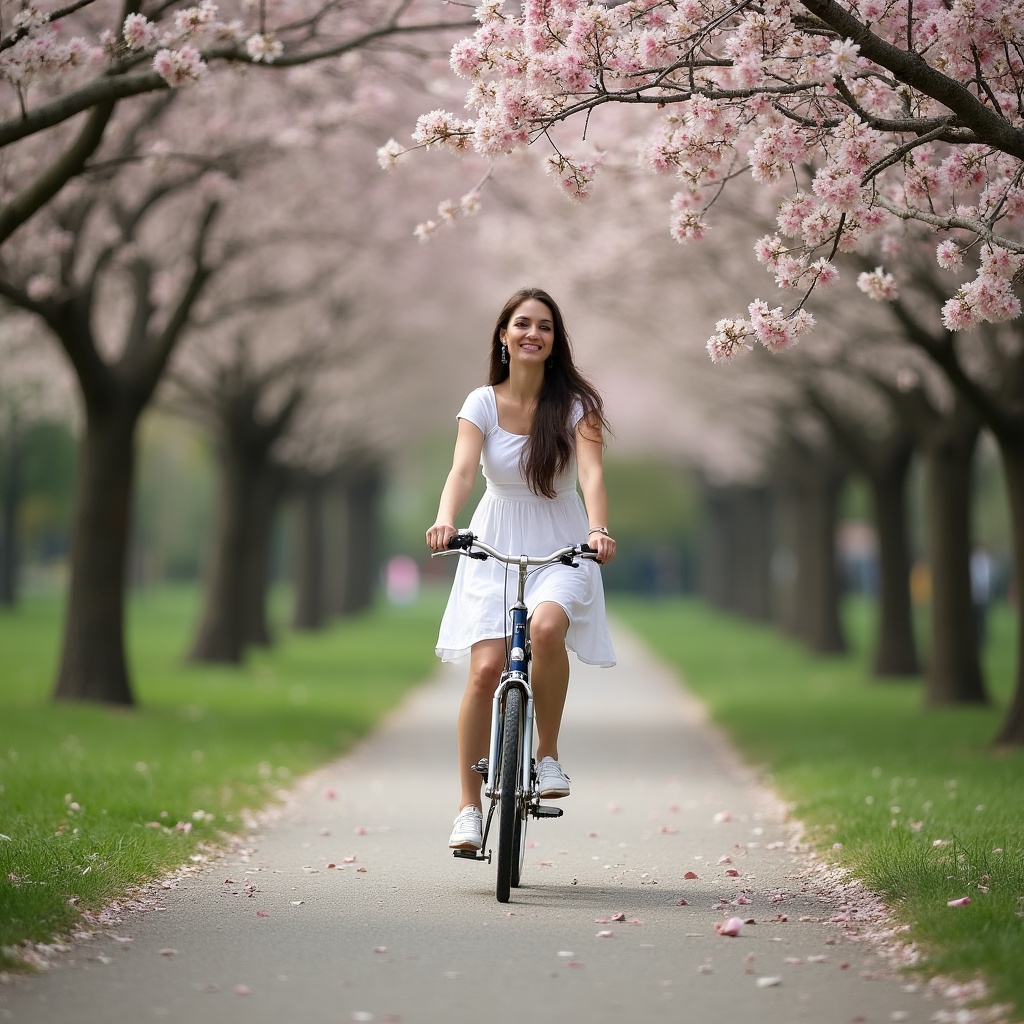 A smiling woman with long dark hair rides a blue bicycle down a paved path lined with blooming cherry blossom trees. She wears a short white dress and white sneakers, surrounded by pink petals falling gently. The scene features lush green grass on both sides and a tunnel of white tree trunks arching overhead.