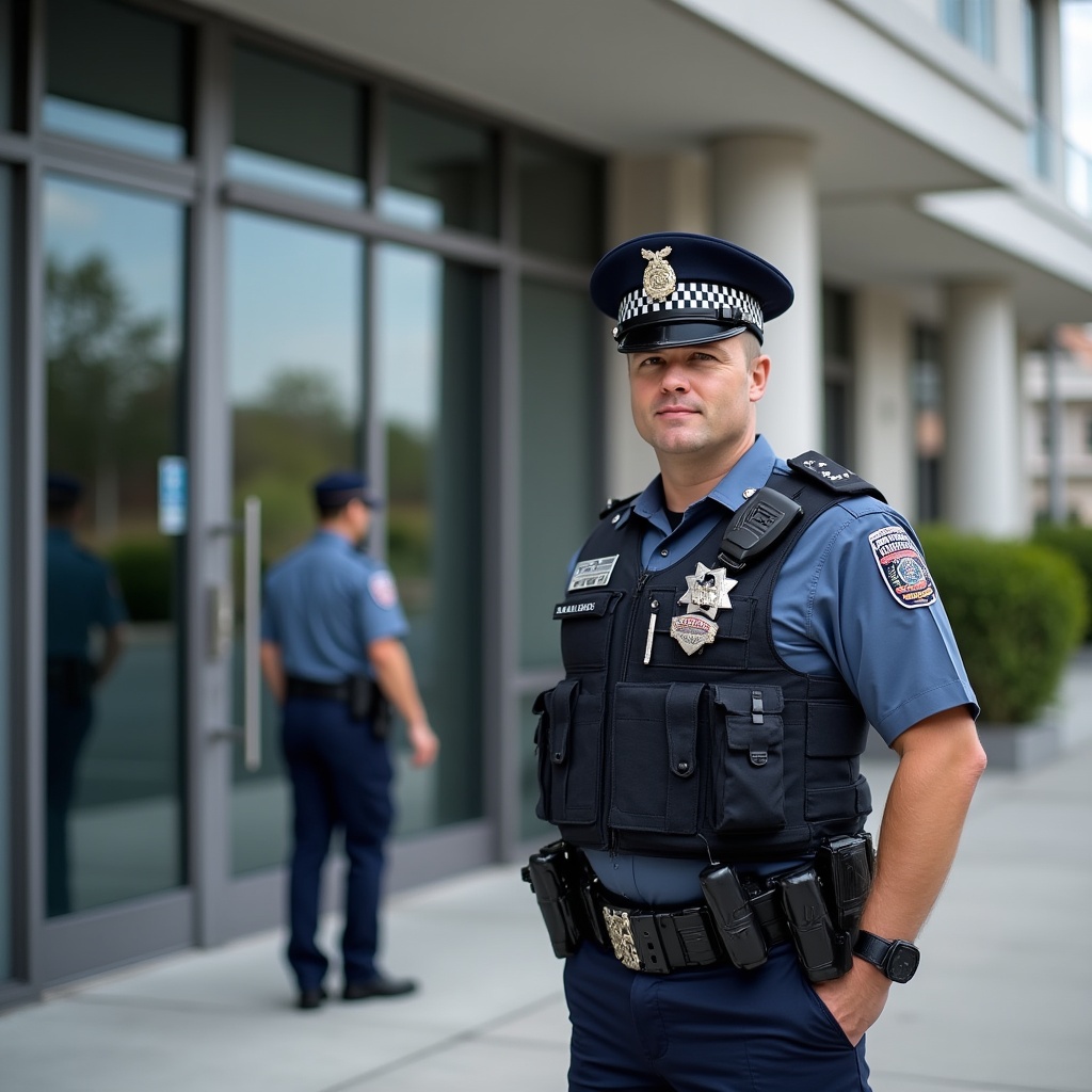 White, blue uniform, blurred background, columns, glass doors, hands on hips, holster, law enforcement, male, modern building, outdoor, patrol, peaked cap, police badge, police officer, radio, security, standing, tactical vest, uniform, policeman