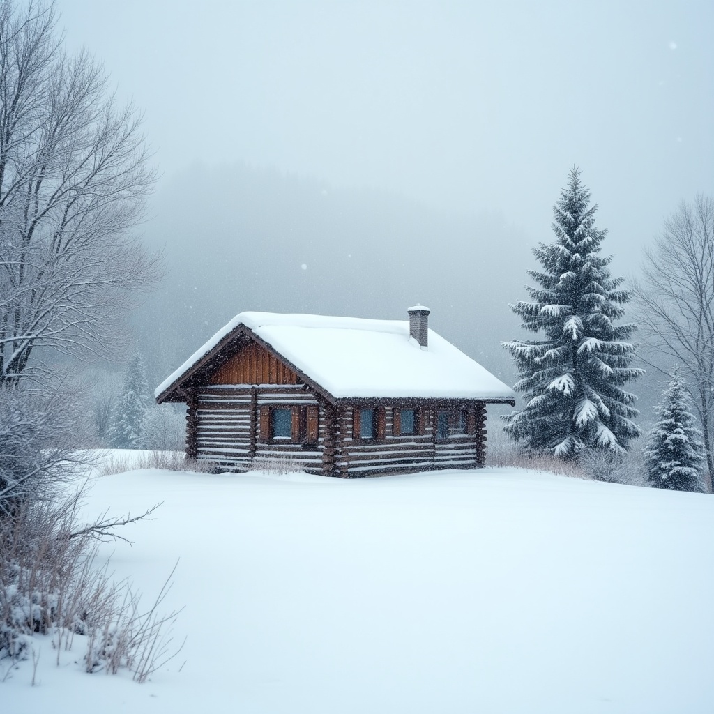Snowy Log Cabin in Winter Landscape
