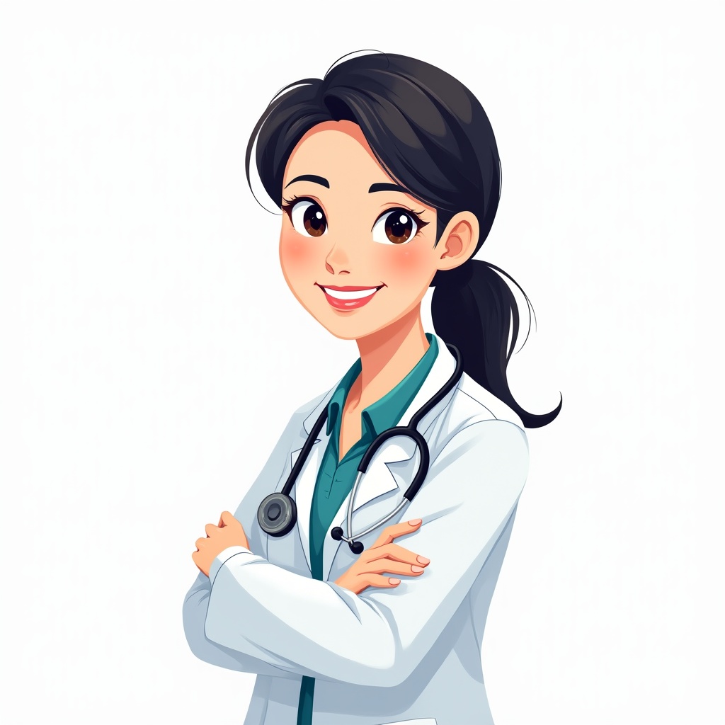 A smiling Asian woman dressed as a doctor stands with arms crossed on a white background. She wears a white lab coat over a teal shirt and has a stethoscope around her neck. Her black hair is tied in a ponytail, and she has large expressive eyes in this colorful illustration.
