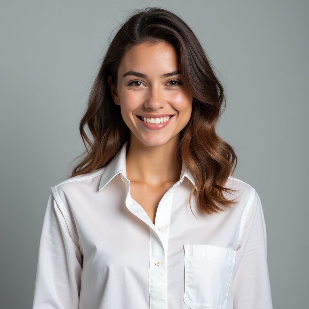 A young woman with long wavy brown hair smiles warmly at the camera. She wears a white collared shirt with buttons and a pocket, standing against a plain gray background. Her expression is friendly and approachable.