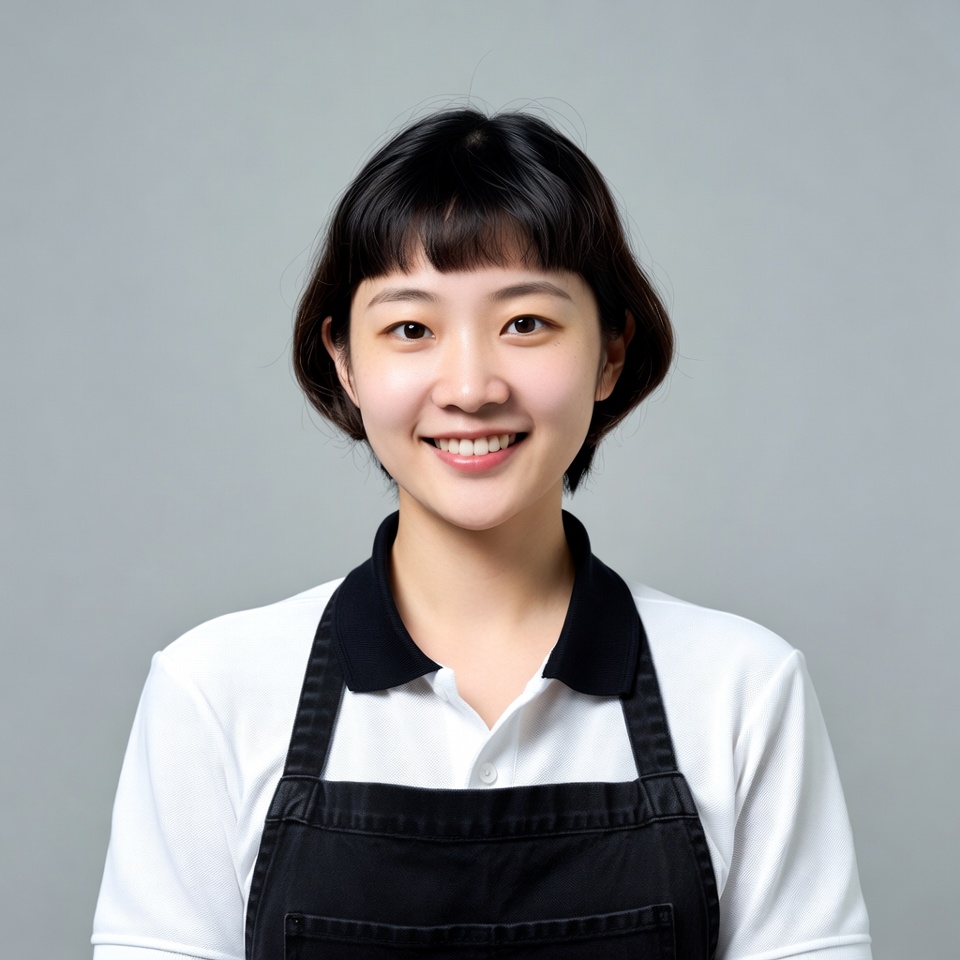 A young Asian woman with short black bob haircut and bangs smiles at the camera. She wears a white collared shirt with black collar and a black apron over it. She stands against a plain gray background.