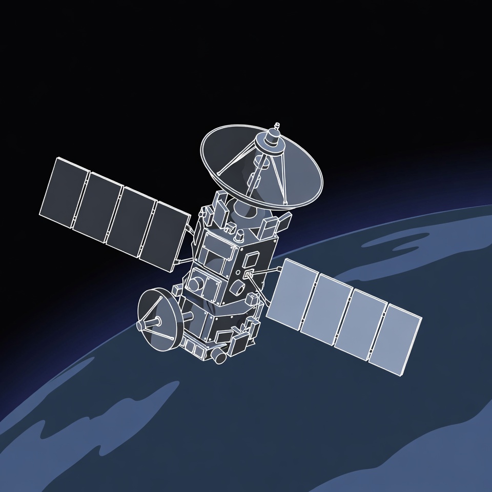 A detailed line art illustration of a satellite in orbit around Earth. The satellite features large solar panels extending from its central body and a prominent dish antenna. It is depicted against a dark space background with the curved blue edge of Earth visible below.