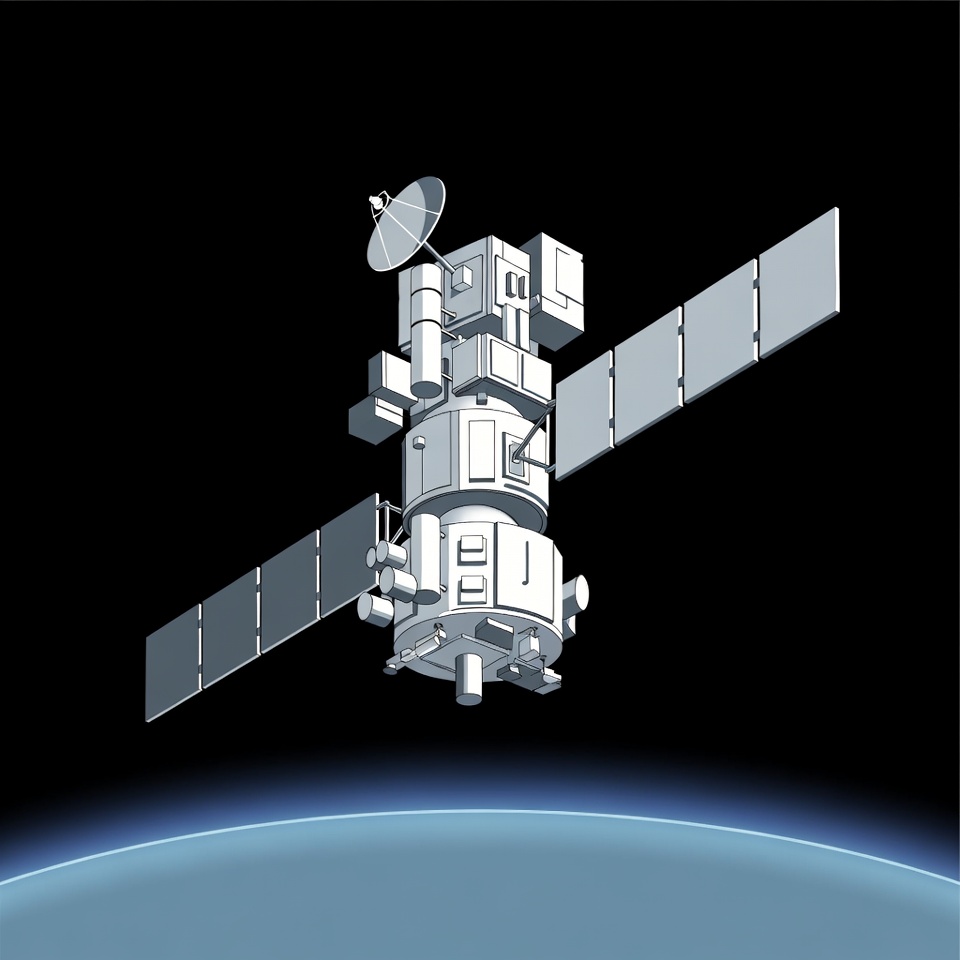 A white 3D illustration of a satellite with extended solar panels orbits above Earth. The satellite features antennas, modules, and communication dishes against a black space background. Earth's blue curved horizon is visible at the bottom.