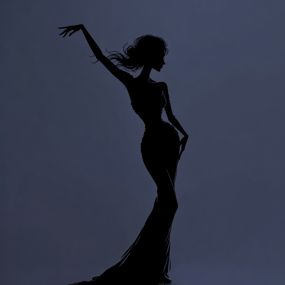 A black silhouette illustration of a woman dancing gracefully on a dark blue background. She has long flowing hair, one arm extended elegantly, and wears a form-fitting gown with a long train. The figure is depicted in profile, emphasizing her slender curves and dynamic pose.