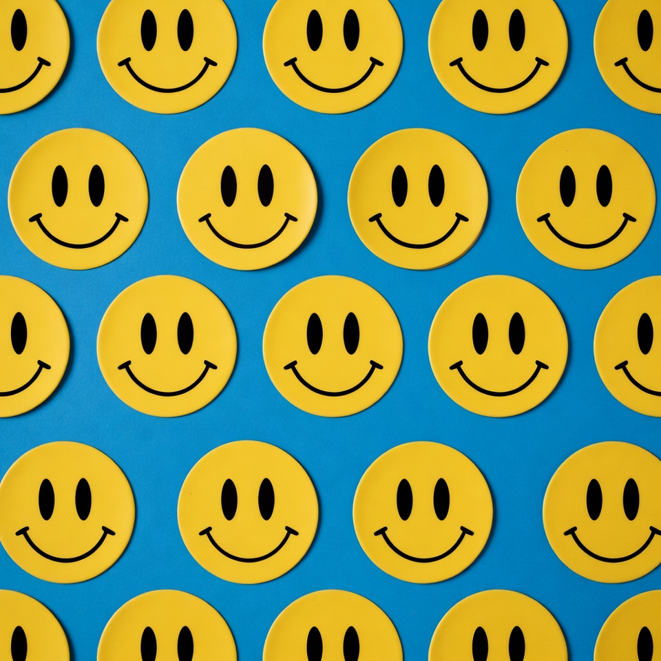 Multiple yellow smiley face stickers with black eyes and mouths are arranged in a grid pattern on a solid blue background. Each circular face displays a cheerful smiling expression. The composition creates a vibrant and playful visual pattern.